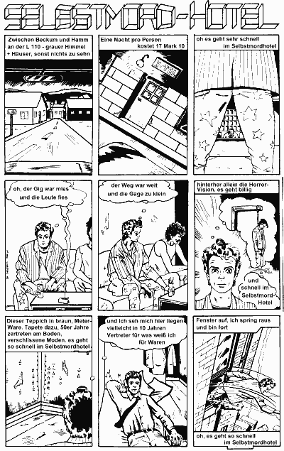 Selbstmordhotel Text & Musik © Nils Selzer Comic: Frank Schröder Zwischen Bekum und Hamm an der L110 grauer Himmel und Häuser, sonst nichts zu sehn eine Nacht pro Person kostet 17 Mark zehn oh, es geht sehr schnell im Selbstmordhotel Oh, der Gig war mies und die Leute fies der Weg war weit und die Gage zu klein hinterher allein die Horrorvision es geht billig und schnell im Selbstmordhotel so schnell - solo - Dieser Teppich in grau, Meterware Tapete dazu, 50er Jahre zertreten am Boden, verschlissene Moden es geht so schnell im Selbstmordhotel so schnell Oh, ich seh mich hier